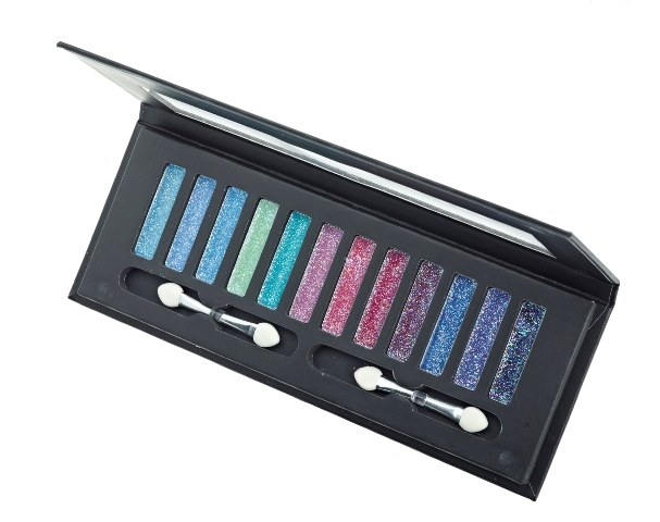 z delikatnym połyskiem, z drugiej – seria brokatowych kosmetyków, które
